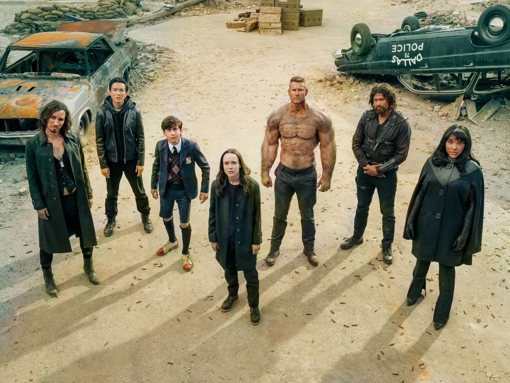 The stars of Netflix's The Umbrella Academy — Elliot Page, Tom Hopper, David CastaƱeda, Emmy Raver-Lampman, Robert Sheehan, Aidan Gallagher and ...